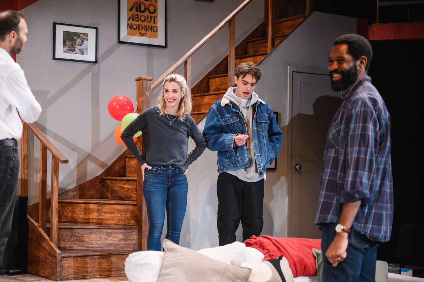 The outside world leaks into this private family home, which is impressively assisted by the lighting (Jamie Platt) and sound (Julian Starr) design, which bring the world to life around this communal space. New sounds are heard as doors open, and light bleeds in from windows and upstairs, all adding to the world still going on around them as their world falls apart inside this home. In particular, phones and diegetic music were impressively designed to create a spatial awareness and come from the devices themselves, guiding an audience’s eye to key and pivotal moments.