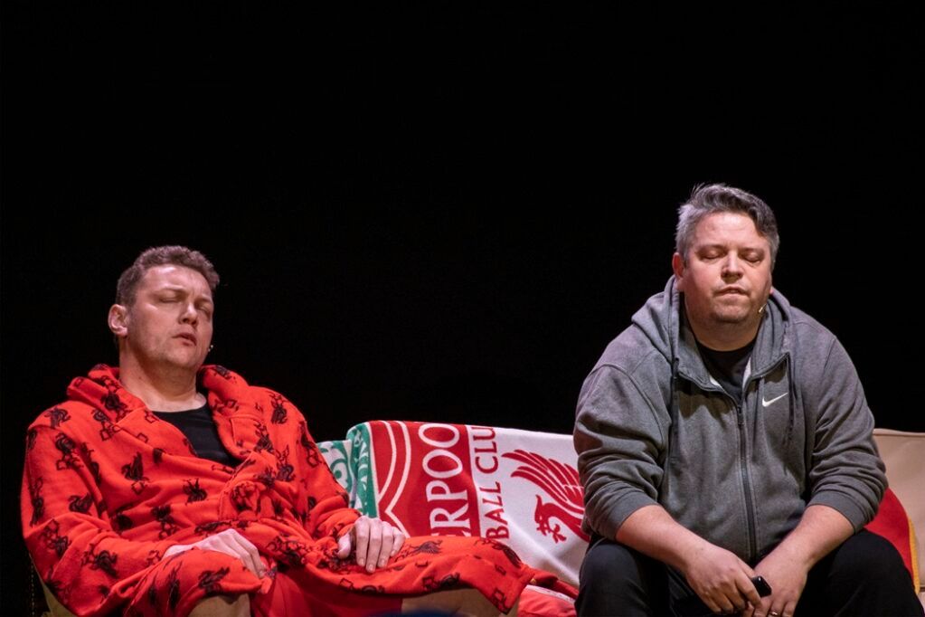 Each cast member’s delivery of the material complemented the story and added believably. Colin Kilbride as John delivers a multi layered performance dealing with constant post-traumatic stress disorder while sleeping. John is the driving force striving for justice and Kilbride delivers the passion needed for such a role. The friendship he strikes up with alcohol dependant Steve (Leslie Longley) grows as the piece progresses. Longley appears initially charming with a typical Scouse sense of humour. His performance throughout is intense and scenes of himself harming are harrowing. With his microphone turned off his raw emotional vocal filled the theatre leaving goosebumps all over.