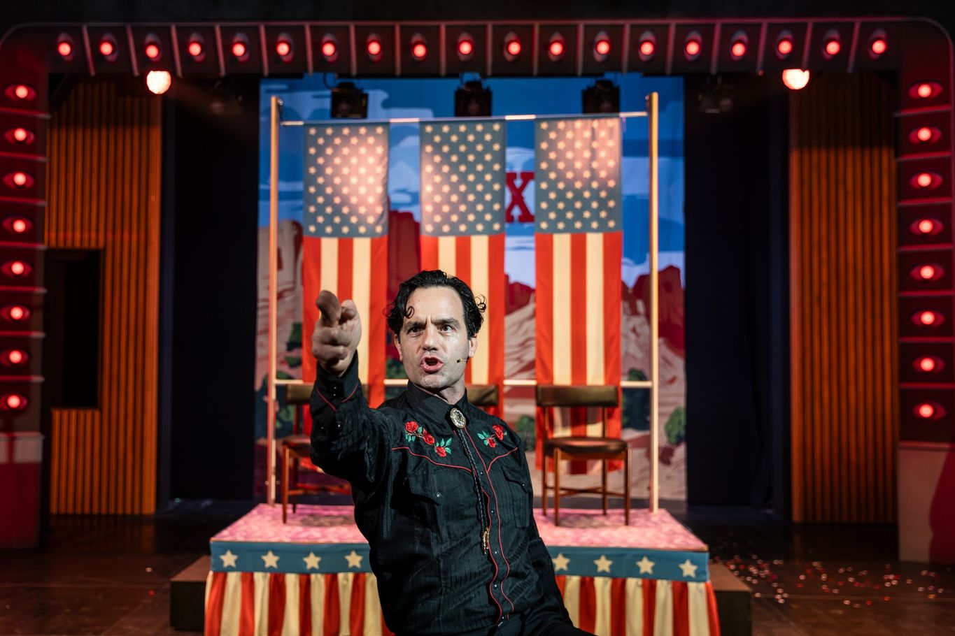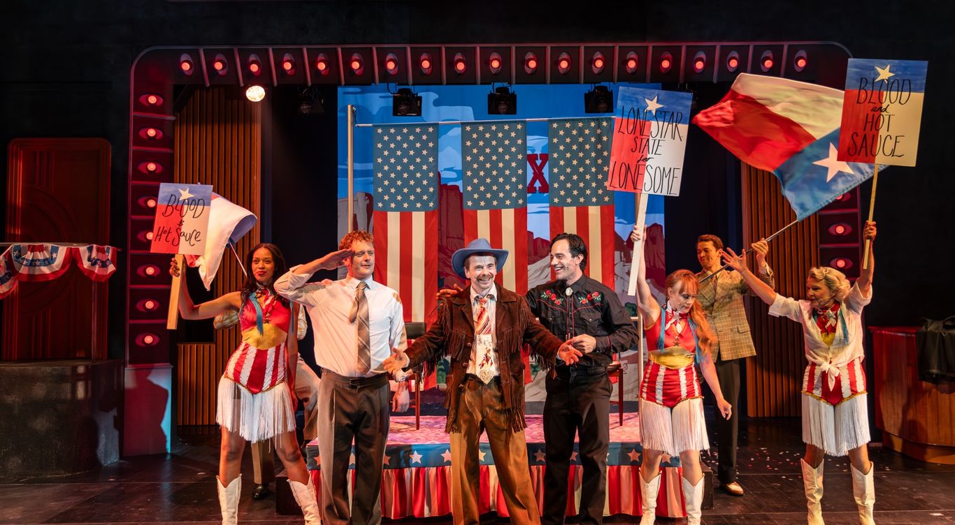 Due to the rugged 1950s portrayal of our lead, much of the romance is lost. I imagine in the film he would have been the type of character who grabs and forcefully kisses a girl to make her fall in love. While Karimloo will no doubt have the audience swooning in his cowboy boots, jeans, and vest combo, there isn’t enough opportunity to explore the emotional depth needed for us to enjoy the role. The most convincing relationship for me was the one with Betty Lou, played by Emily Florence in her professional stage debut, but even her character came across more as a social climber than someone genuinely in love.
