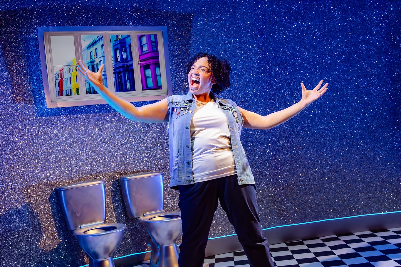 Lizzy Connolly’s direction works well as there isn’t a huge stage to work on but she has made good use of what space there is. Likewise Reuben Speed has done an excellent job with the set and costumes. The set doesn’t change and is a very sparkly pink with the addition of two silver toilets which are put to good use. The costumes are also simple but work really well.