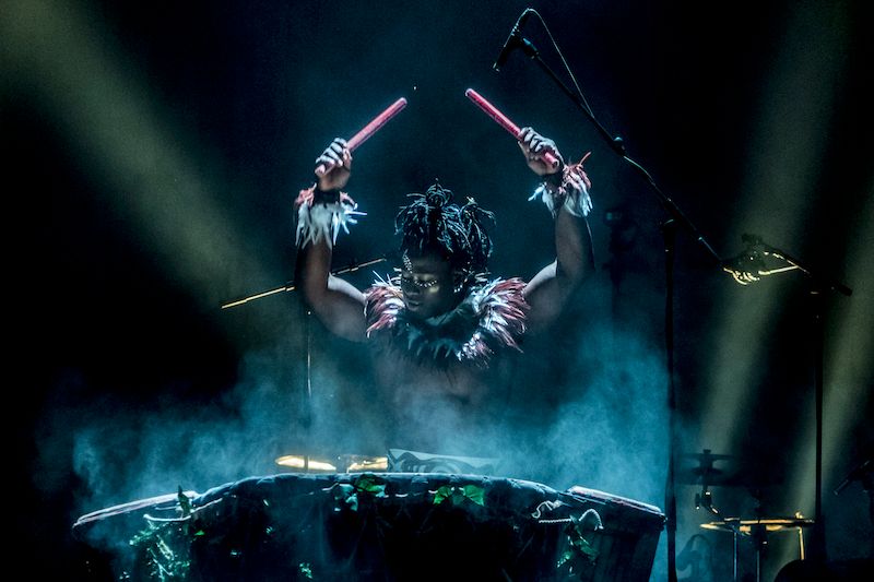 The show begins with a cast member whose echoing loud voice, reminiscent of a planetarium voiceover, sets the scene. This performer introduces us to the kora, a traditional West African stringed instrument. The kora, which has 21 strings that are plucked to produce music, is played throughout the show along with a band and additional on-stage drumming, creating a contemporary sound of Afro-jazz percussion. This is the first circus performance I have seen with live music, and it significantly enhanced the overall feel of the show.