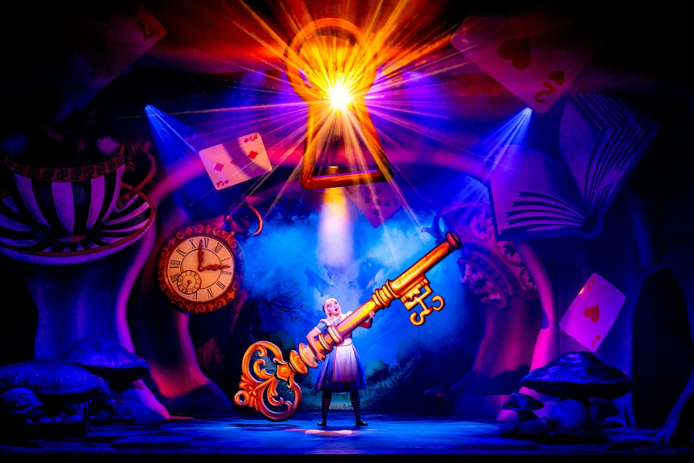 Enough cannot be said about the design of the show, it looks like it's been ripped from a page in a storybook. With its cartoon-esque style, the set feels very inspired by the classic Disney animated version of ‘Alice in Wonderland’; the multi-layered stage frames are covered in an assortment of playing cards, clocks, books etc, which, when paired with the blue and purple hues of the lightning, create the illusion of falling down the rabbit hole. It’s magical and has us feeling excited to see the show unfold.