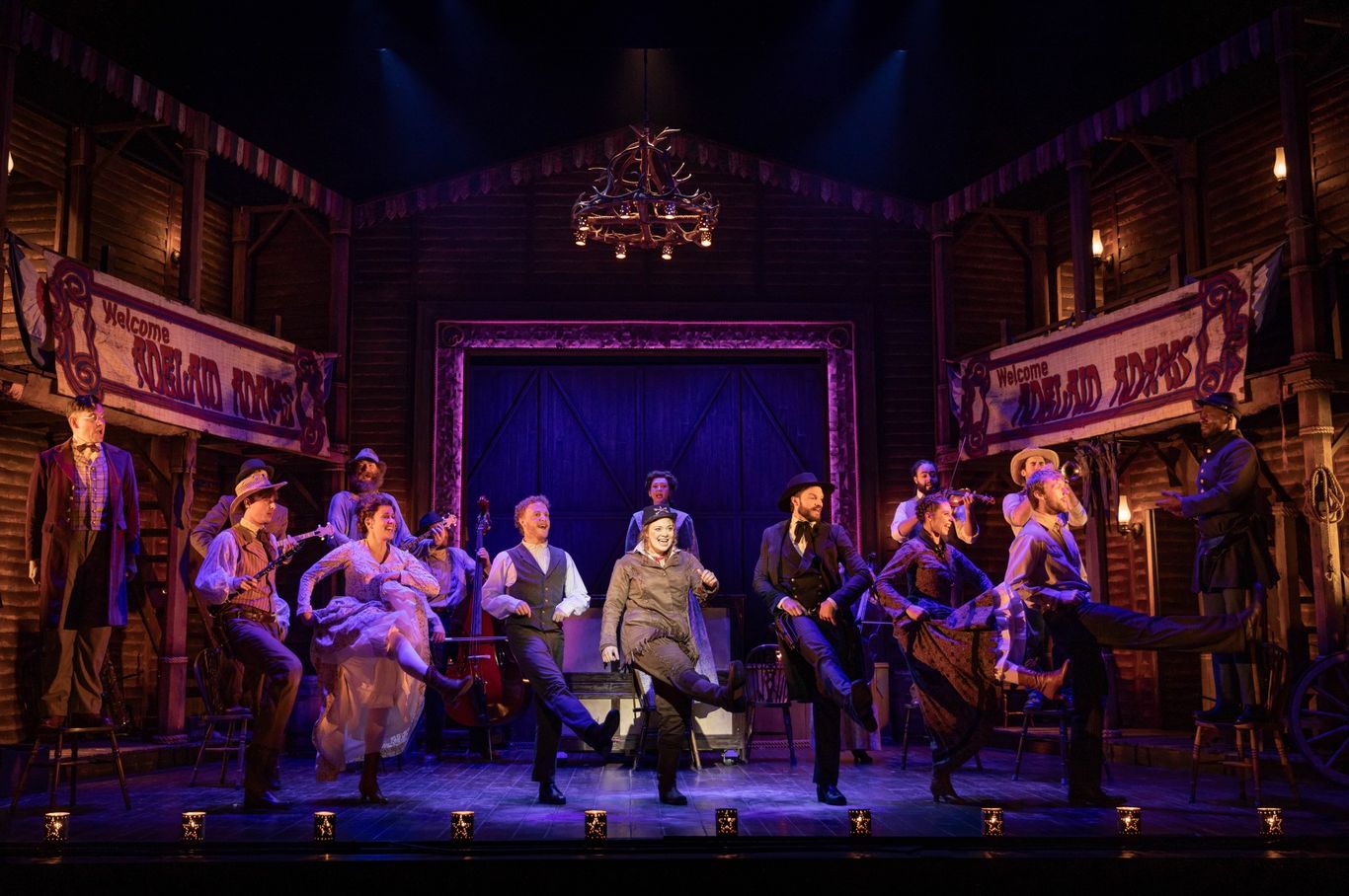 Vinny Coyle acts opposite Fletcher as Wild Bill Hickok, who stands up against Calamity, calling her out for her exaggerations. Coyle has a more sophisticated take on the role and brings a gentler than expected tenor vocal to Wild Bill’s musical numbers, including ‘Higher Than A Hawk’, compared to Howard Keel’s rich bass-baritone singing voice. The dynamic between the two leads is strong and their on-stage chemistry is a real strength of this production. The rest of the cast is almost entirely made up of actor-musicians who provide both the musical backing and the vocals for each number. This makes for a fun and unique interpretation which creates a sense of community where it almost feels as if the cast are coming together at the saloon for a friendly sing-along.