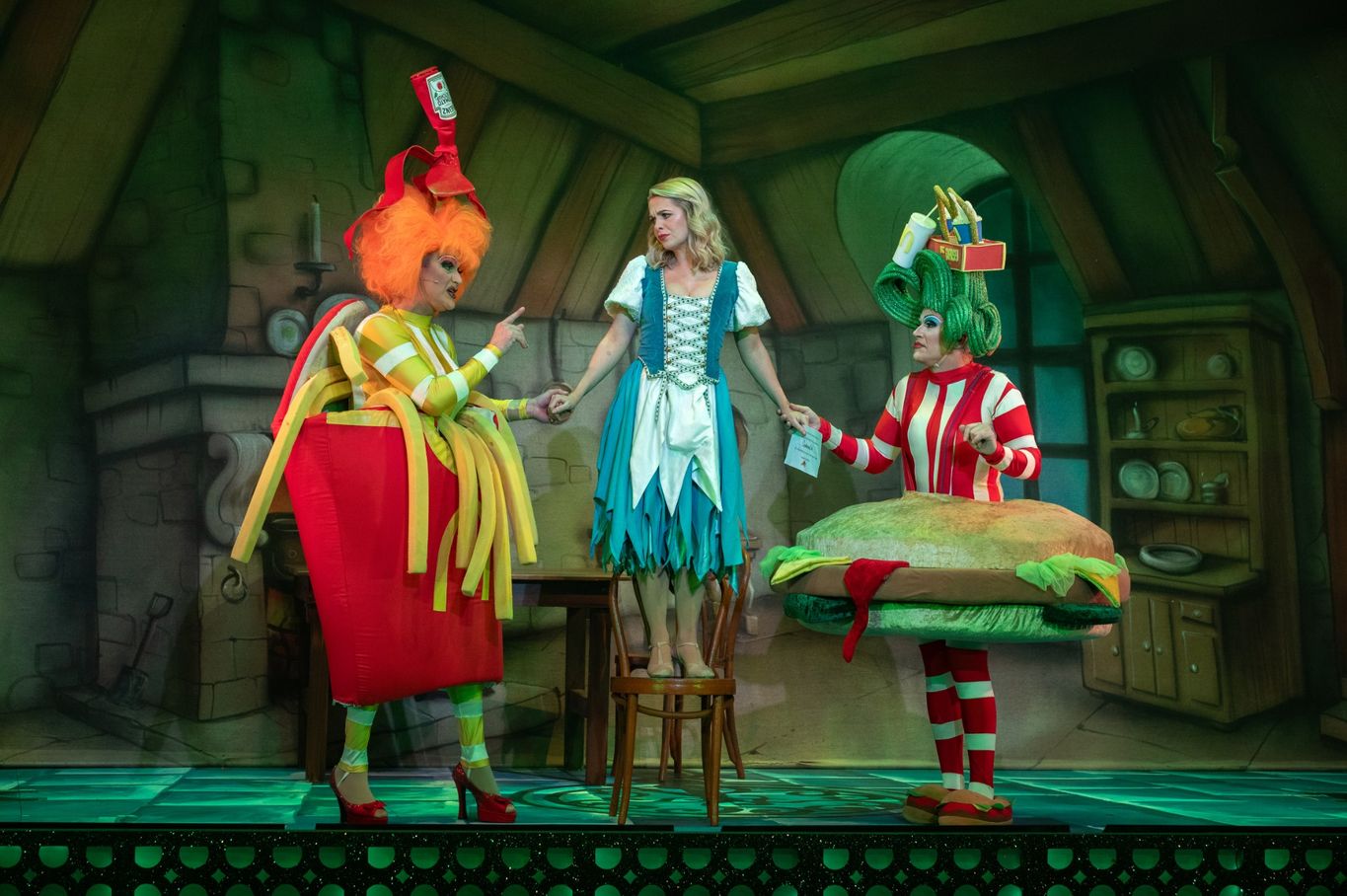 The staging, designed by Jon Harris, Jason Bishop and Ian Wilson provided a sparkly proscenium that lit up with impressive lighting by Andy Webb, adding to the overall look and feel of the show. The band, with Tom Self at the helm, who gets involved in the production in more ways than one, provided a wonderful sound, treating us to modern pop songs, updated for Panto season. We meet the Fairy Godmother in the shape of Coronation Street star Katie McGlynn who provided lots of Northern wit and charm through her performance, with plenty of Corrie references thrown in for good measure.