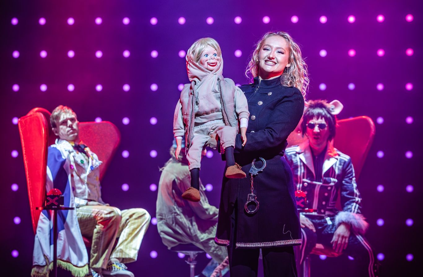 There are some lovely set pieces including a very clever The Voice/Britain’s Got Talent/X Factor scene where Liam and Damian put together a beige boyband to aid them in their world domination, with Fairy Bowbells joining the judging panel as a certain high waisted Judge! There is also a lovely nod to East 17, and giant mobile phones, together with the enlisting of the audience, and an audience member in the action.