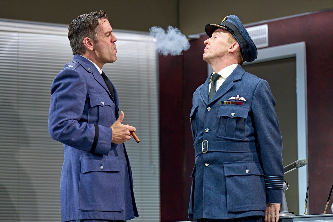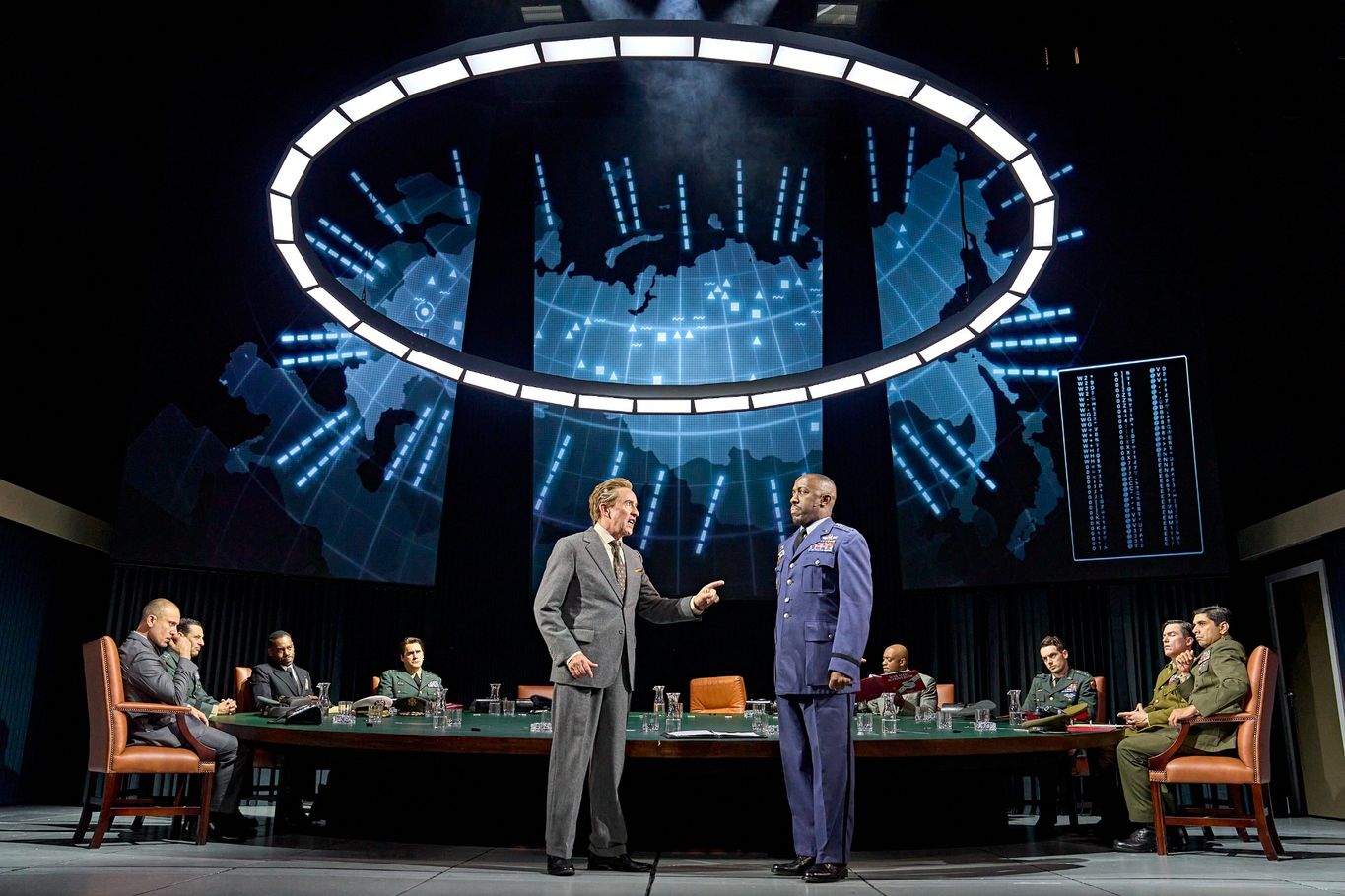 Given the farcical tone, you might have some idea of what to expect. However, I was surprised by just how many roles Steve Coogan would be playing. Each one was performed excellently, with what must have been some lightning-quick costume and wig changes. Coogan plays Dr. Strangelove, Captain Mandrake, President Muffley, and Major T.J. Kong. Clever use of body doubles gives the impression that two of these characters are still on stage at times. His portrayal of Captain Mandrake, a British RAF officer, is reminiscent of a young Prince Charles, while Dr. Strangelove, with his wheelchair, stiff ‘robotic’ arm, and German accent, couldn’t be more different.
