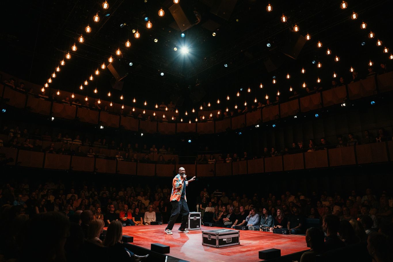 The audience is fully engaged, in part due to Henry’s charisma. He’s electric on stage, unafraid to move with the flow of the audience’s reactions and the sentiments in the script. He’s utterly captivating in his control of the tone of what’s going on, almost mirroring the experiences of the child in the script from taking us through epic highs and deeply moving lows. He’s creative with the improvised parts, using a jacket as an injured dog and exchanging reading glasses between audience participants.