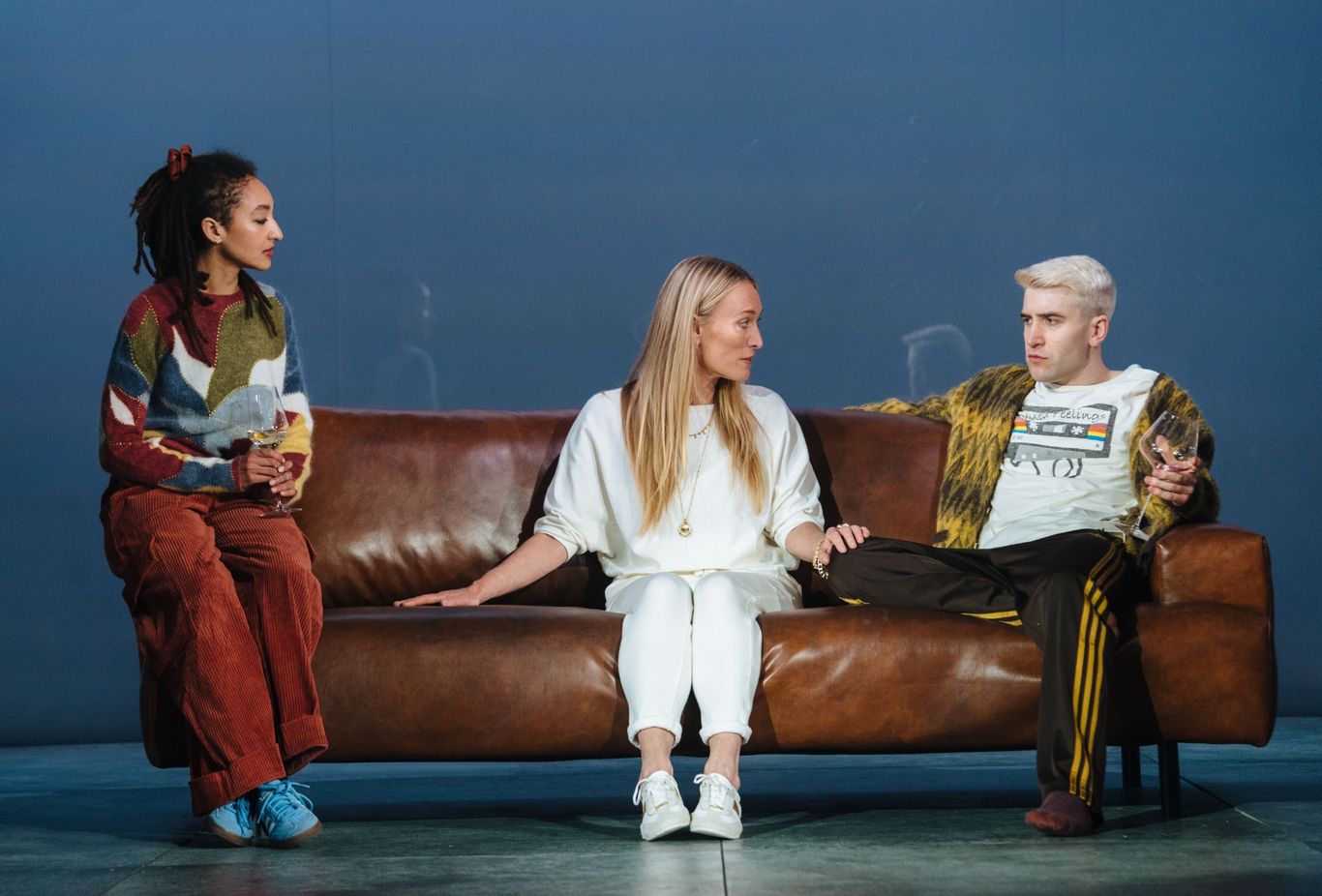 The five-strong cast each deliver impressive performances, but Callum Scott Howells as Oz is the standout. His portrayal is raw, authentic, and unpredictable—seamlessly shifting between emotional intensity and sharp comedic timing. Victoria Smurfit also shines as Helena, the emotional anchor and driving force of the story. As her character grapples with a series of revelations and buried trauma, Smurfit draws the audience into her turmoil with a performance that is both powerful and haunting.