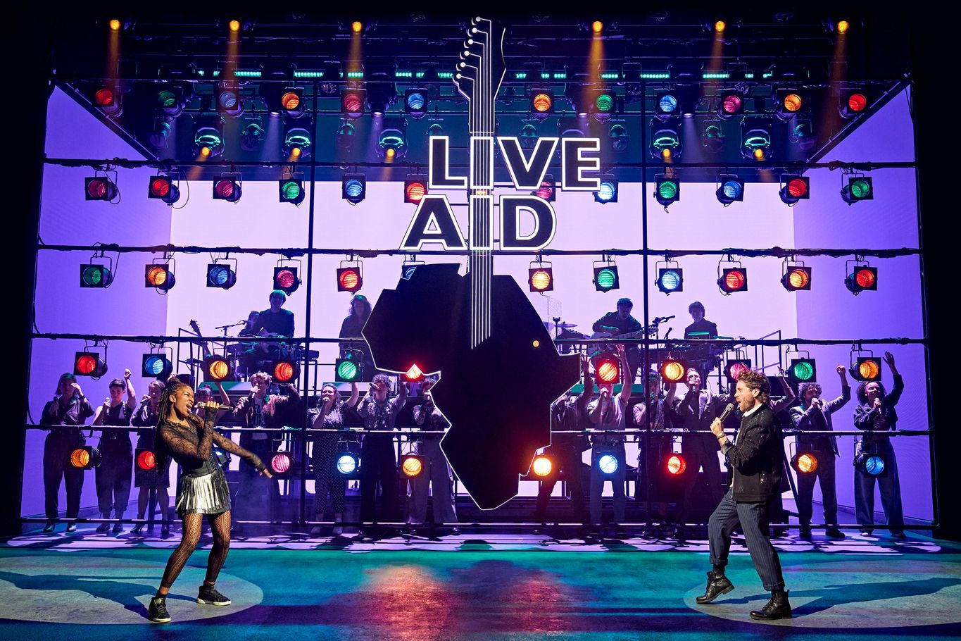 The spotlights are on the audience as we enter the theatre. Highly appropriate, since it’s the audience response to the Live Aid Concert in July 1985 that made it the success it was.