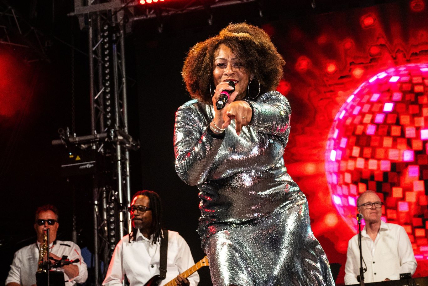 The seven-piece band is first to appear on stage, and they strike up with power and energy, Earthing us in the era. This is a classic line up of keys, guitar, drum and bass with the addition of the ever-present, energetic and choreographed horn section, bringing the Wind. Each of the horn section (Lee Hallam: Trombone; Pelham Wood: Sax and Dylan Herbert: Trumpet) is gifted a solo at various points in the evening and they don’t disappoint. They also add subtle texture with additional percussion, which they play with the same entertaining choreography that they bring to the rest of the set.