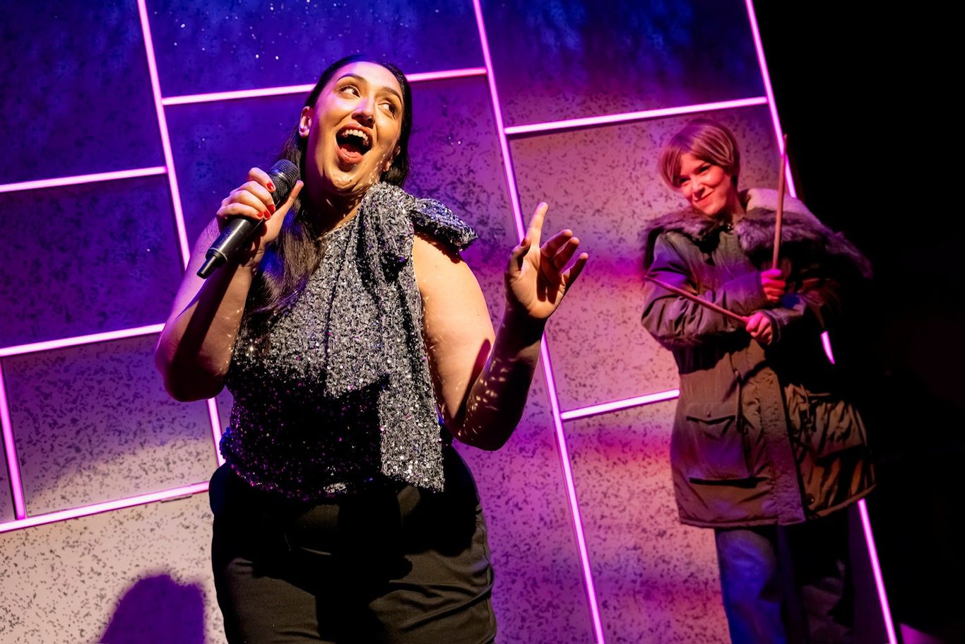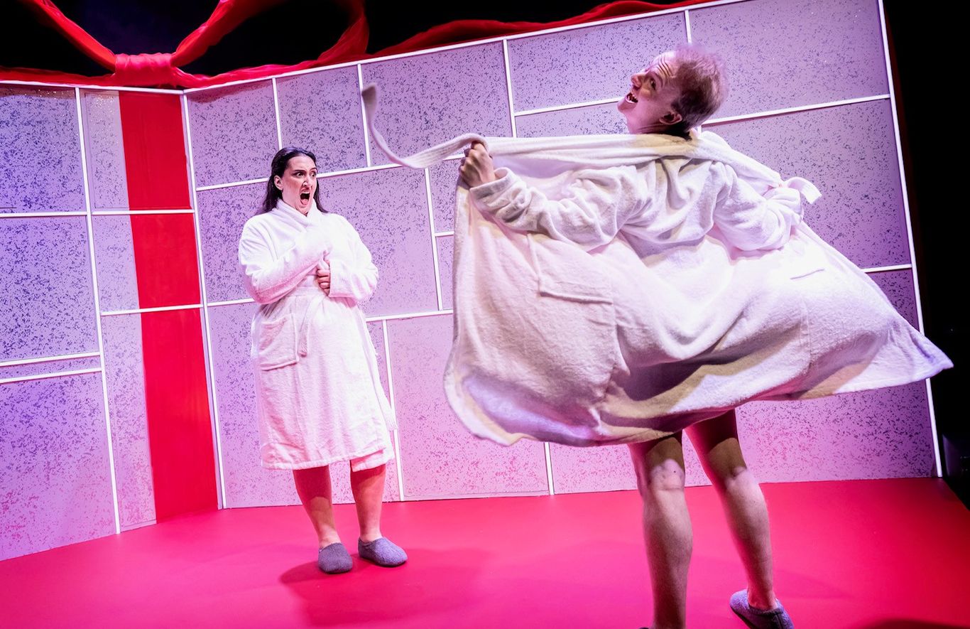 The set, designed by Louie Whitemore, has been quite literally gift wrapped, hiding more than a few surprises. Given the size of the studio space, this works really well in allowing actors to both make best use of the space. It also allows for more dynamic direction so that we aren’t always sure what or who is going to pop out from where, keeping us fully engaged throughout.