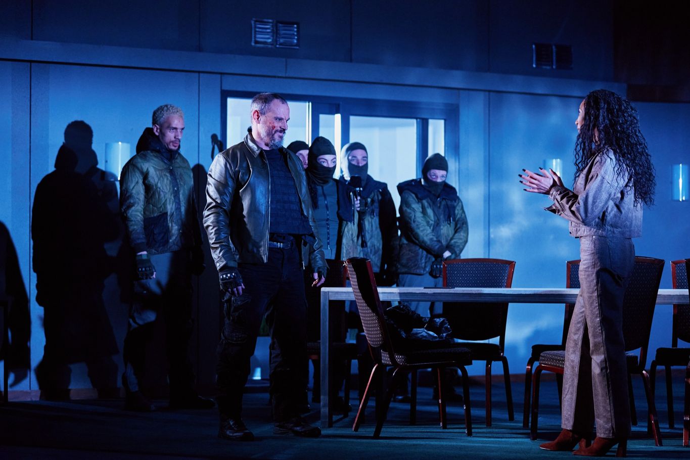 Set within a militia group’s hideout, Twyman’s production has more in common with Alex Garland’s Civil War or HBO’s The Last of Us than a traditional staging of Macbeth. This setting effectively underscores Macbeth’s descent into violence and hallucinations, presenting a raw, brutal take on the play’s themes. Special praise must go to Will Duke for their dynamic video design, which is cleverly integrated as CCTV footage or live-streamed via a mobile phone on the top right-hand side of the set. This technique lends a sense of intimacy to pivotal scenes, such as Macbeth and Lady Macbeth’s plot to kill Duncan and the murder of Lady Macduff, while also being visually striking.