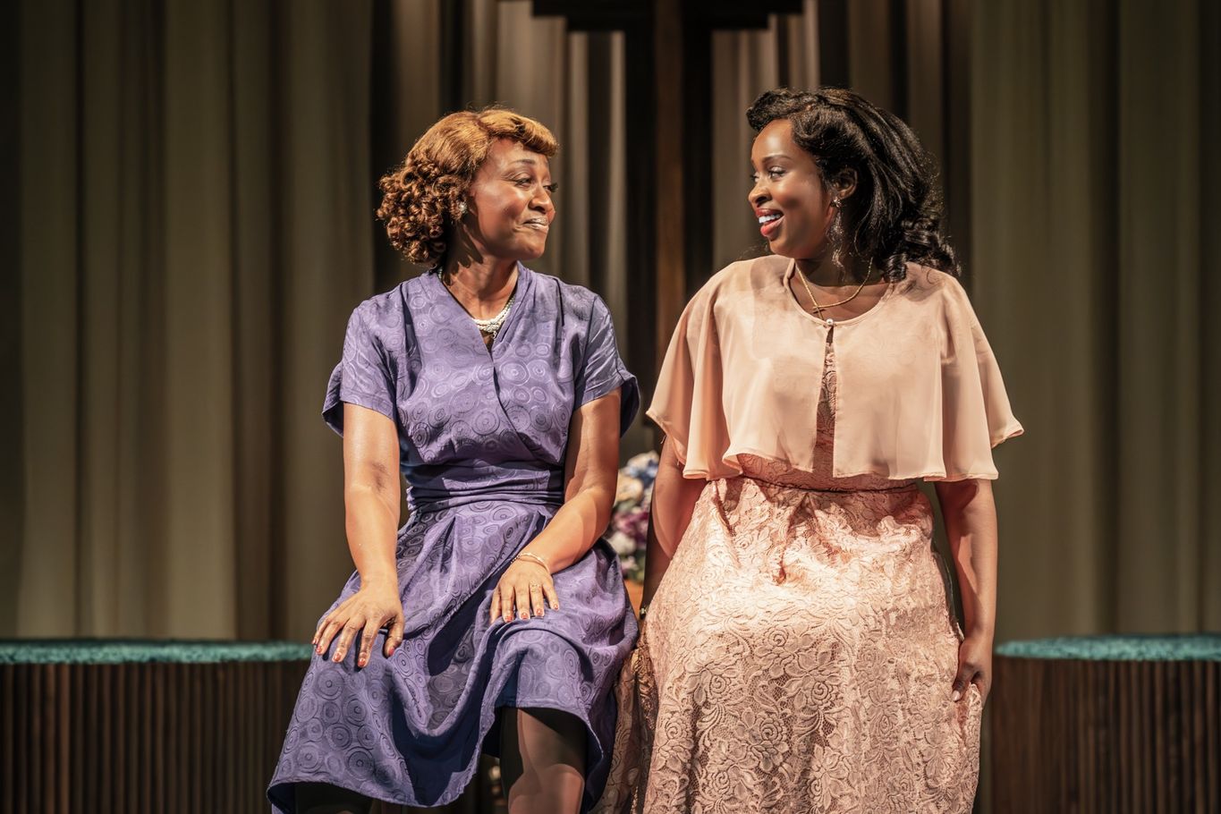 The musicians are on stage throughout, hidden behind thin curtains that open and close when we are treated to their talent. All of them should be commended for their ability to fill the theatre with the most joyous and heartfelt music which complemented the story beautifully. The staging by Lily Arnold was indictive of it’s 1940’s backdrop, with thick green carpet in circular formations which was covered inch by inch by Knight and Ndlovu throughout the show. There was a large coffin adorned with a beautiful floral arrangement and a large crucifix at the back of the stage, offering that constant reminder of how pivotal faith was to both of these characters.
