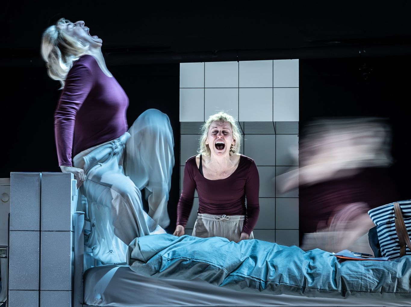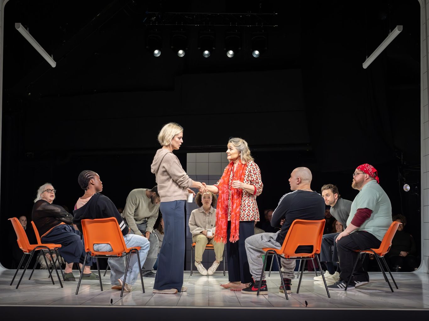 Bunny Christie’s clinic framing the stage is stark and striking all in white with bright lighting conjuring up the world of rehab. Some audience members seated at the back of the stage are close to the actors and the rest of us can see their reactions, which adds to the tension.