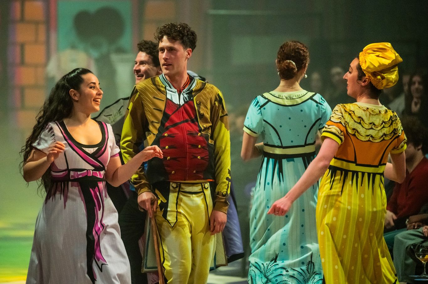 Penny Challen has taken the traditionally classic rustic countryside and manor house look and replaced it with an explosion of bright and bold colours. As soon as you enter the theatre the interior is no different transporting you into a world full of pop colour which sets up the show quite nicely.