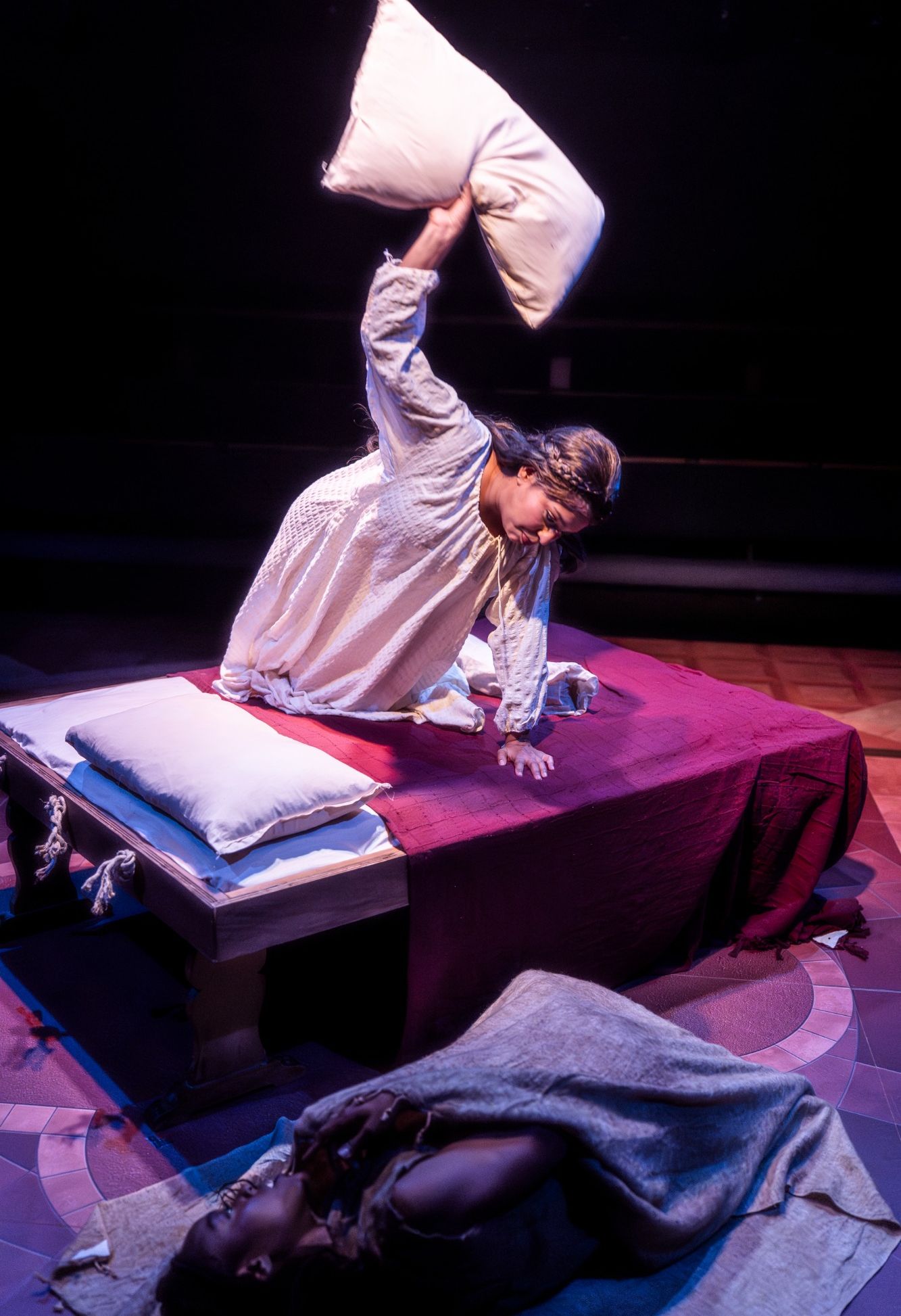 In contrast to the setting, the voice and delivery adopt a modern, American, valley-girl-esque tone. Chiara Atik’s script draws comparisons to contestants on The Bachelor. This deliberate choice pulls the audience in straight away, though many of the nouns and situations remain rooted in their medieval origins.