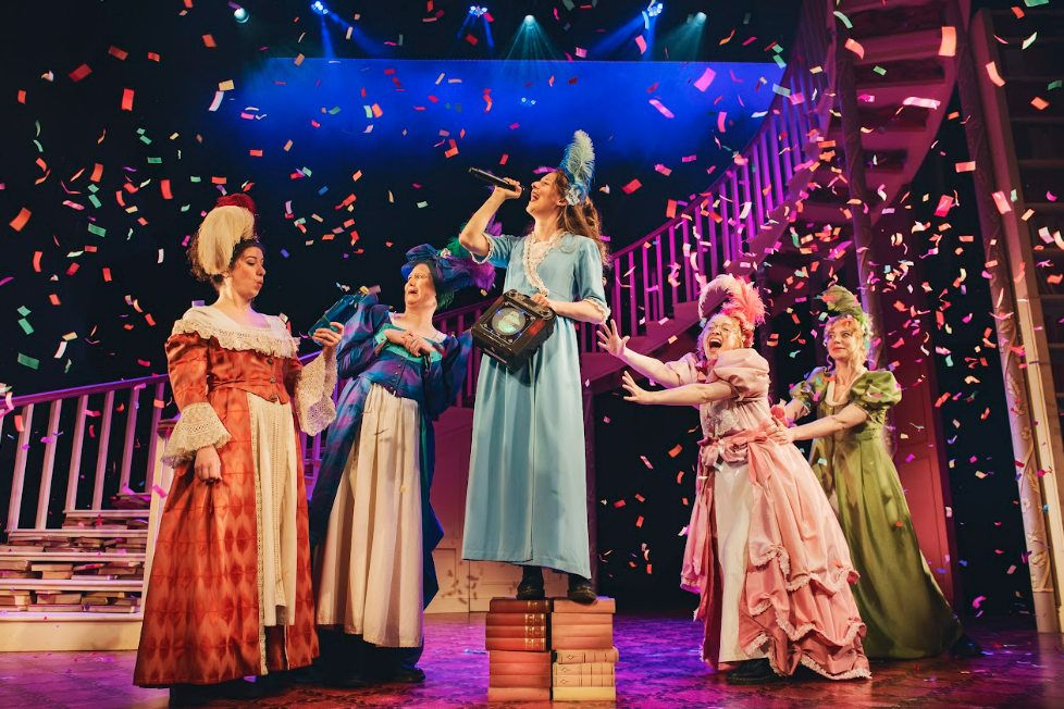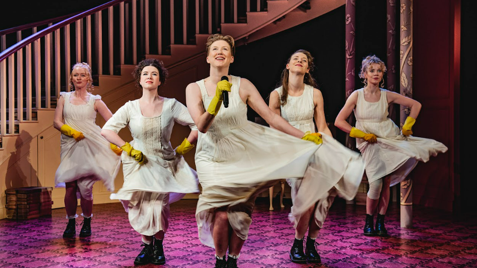 Firstly, I must make mention of the performers, Lucy Gray, Dannie Harris, Leah Jamieson, Emmy Stonelake and Megan Louise Wilson who work so incredibly hard, whilst remaining on stage pretty much all the way through this 2-hour 35-minute show (including interval). We are introduced to them to the soundtrack of the Elvis Costello classic ‘Every Day I Write the Book’ sung through the aid of a portable karaoke machine and handheld microphones which feature heavily bringing us some bizarre, but great musical choices that are slotted in throughout the show. The songs of Bonnie Tyler and Candi Staton never really made me think of Jane Austen before, but after seeing the show I have different thoughts!