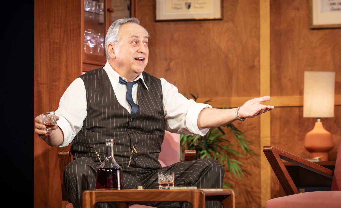 Walking into the theatre the stage setting is nothing short of a visual feast. Designed by Frankie Bradshaw, the set mimics an office from the Mid-Century Modern era, characterised by wooden panelling, a space-age clock, and G-Force style chairs. The set’s slightly off-tilt orientation subtly suggests the skewed reality of the times, enhancing the thematic undertones of surveillance and ideological imbalance. The genius of the set lies in its colour scheme—shades and tones of red and blue are spread so subtly throughout that their significance sneaks up on you, mirroring the creeping tension of the era’s political divide.