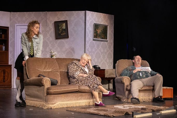 Set against a backdrop of 80’s hits scene changes were presented as a blackout on stage, with stage management dragging props on and off whilst lights shone out to the audience from the front of the stage. It sometimes felt long and it was a shame it wasn’t directed in a way that could have included the actors and could have encompassed even more comedy. The periods of time whilst scenes were changed were supported by music related to the previous scene being blasted into the theatre. ‘Under Pressure’ by Queen used when Bob felt Michelle was onto him regarding his affair and ‘Our House’ by Madness after visiting the home of Sue. Whilst it was great to hear these iconic tunes it took us away from the story repeatedly.