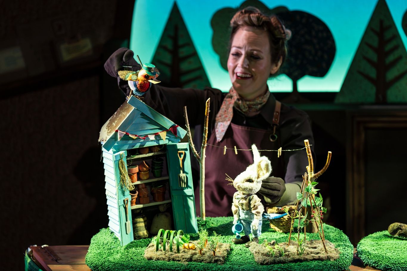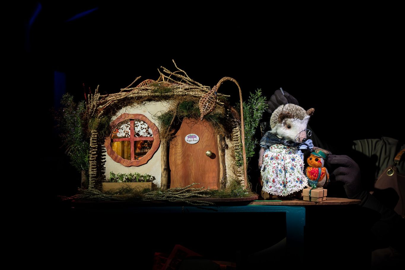 The Little Angel Studios have once again turned their space into a gently immersive world of magic and merriment. For those who may be unfamiliar with this style of show, the best explanation is to describe it as stepping into the world of Beatrix Potter, with the story (and parcels) carried by friends both feathered and furred. Seating is arranged in rows with chairs and soft blocks facing the stage, and some mats on the floor at the front for those wanting to be a little closer to the action.