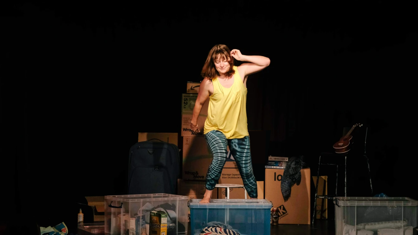 This show is very physical, Heather jumps around the stage with ease and grace. Moving us from a makeshift surfboard, to an office, to a Synagogue, and with little set it is no mean feat but is easily achieved here with just the use of some storage boxes filled with props to set each scene.