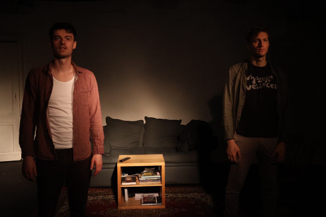 The set is nothing to write home about. A battered sofa, a collection of books on a small coffee table (the titles of which give us a clue to how the story might unfold) a chair, all surrounded by clinically white, and yet at the same time rough walls. Let’s hope the play has more to offer.