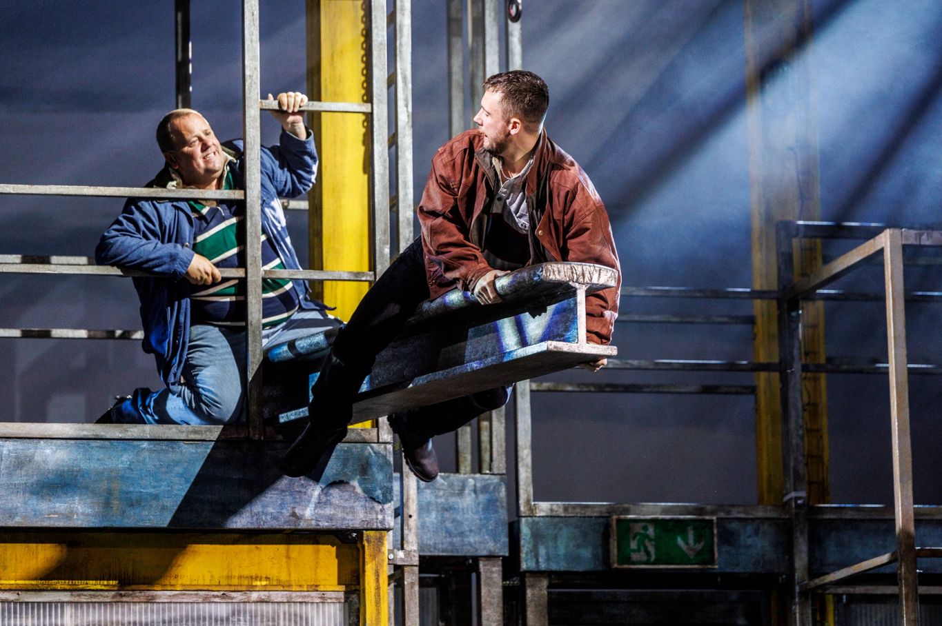 The staging by Jasmine Swan has an industrial feel, depicting the Sheffield landscape of the time. The large metal structure serves well to take us to many places throughout the show and is moved around by the cast with its own choreography, whilst many classic pop tunes blast out, including M People’s ‘One Night In Heaven’ and Chumbawamba’s ‘Tubthumping’.