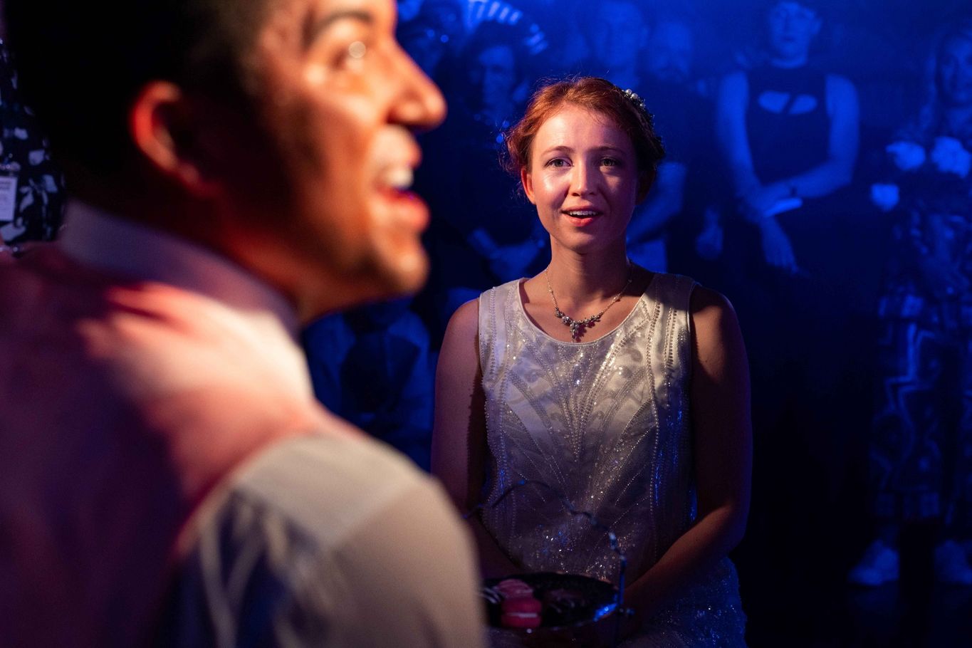 The whole cast must be commended for a valiant performance. Not once breaking out of character for the whole duration of the show and creating a good rapport with the audiences from the outset to enhance the immersive experience. A standout performance comes from Seren Vickers who plays Jordan Baker – having previously seen Seren in a past Theatr Clwyd production, it is evident how well she adapts to different roles that she plays and brings her characters to life. She embodies the ‘party girl’ vibe and really contributes to the atmosphere of the party. Jack Hammett takes on the role of Nick, the main storyteller of this production and brings a real endearing quality to the production. Seren and Jack have such chemistry together as part of their riveting love story. Richard McIver portrays Jay Gatsby in such a swoon-worthy way, demonstrating a slight arrogance in his grandeur.