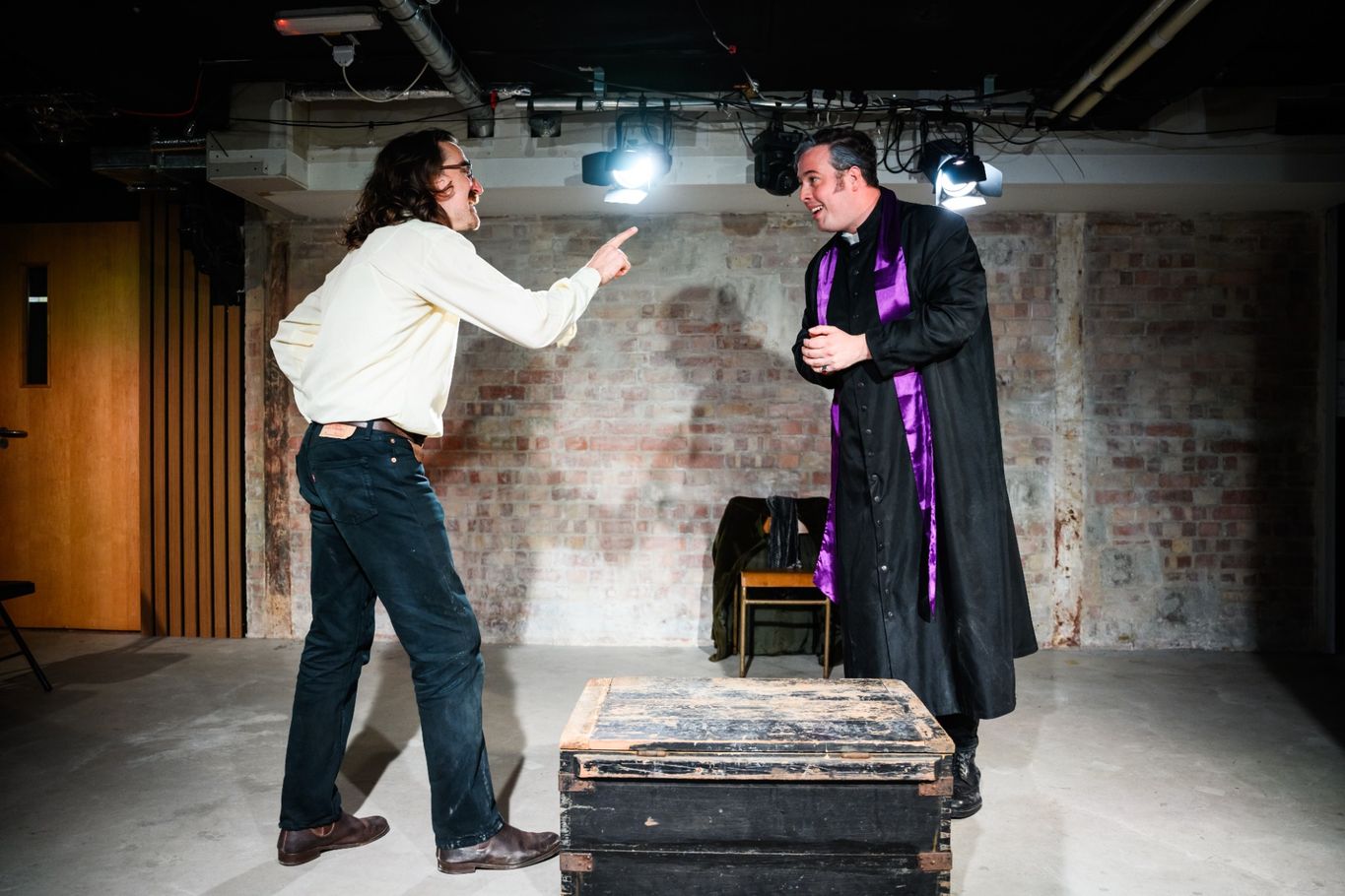 Offstage voices are used throughout, and while not ground-breaking, they are effective and reminiscent of similar techniques in other productions. Demaine enters as Daniel Farringdon wearing what can only be described as a Johnny Depp-esque outfit: long beaded necklace, unbuttoned shirt, and a general air of theatrical swagger. His accent was difficult to place; there was something vaguely northern about it rather than London-based, but this did not seem especially important to the character. Farringdon is clearly positioned as the bolder presence, the “actor” of the duo.