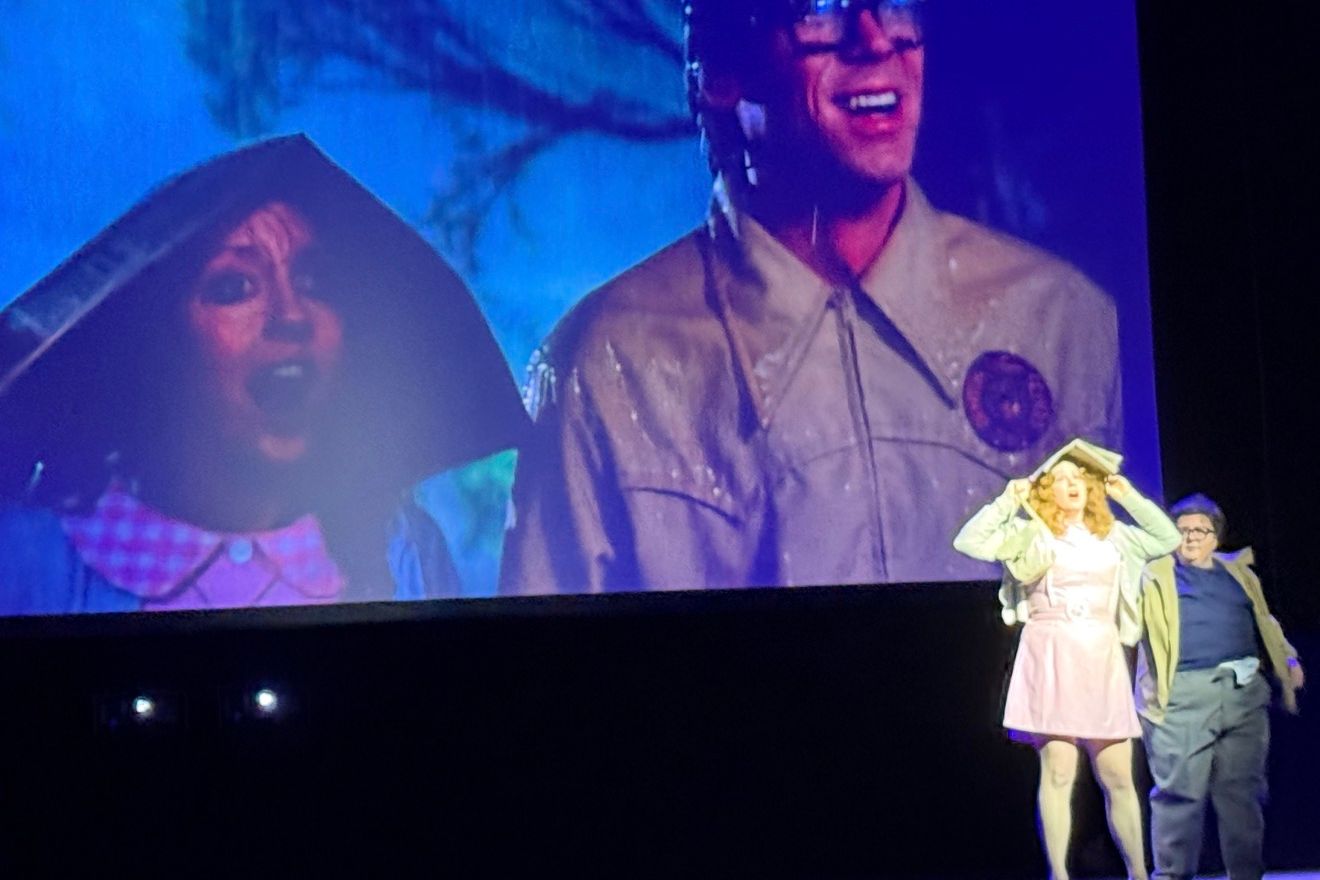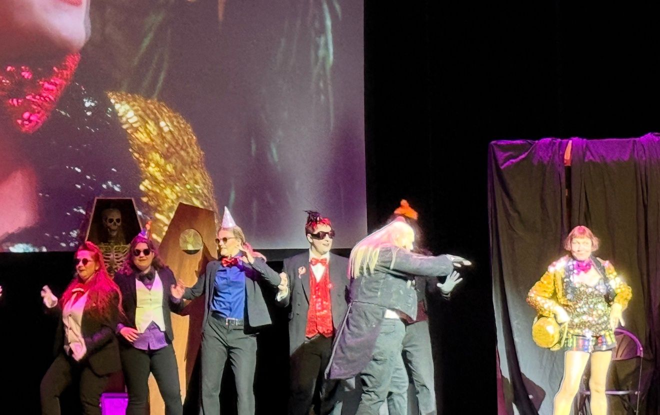 Our host for the evening is Larry Viezel, head of the Rocky Horror Show Fan Club. He appears to know the show inside and out. He has a no compromise approach to the show “Enjoy it or go” (an edit of his actual phrase for our more delicate readers). His insight includes knowing when every character opens their mouth – he’s always there to pop something into it! You have to be there to know – which is probably the tag line to do with anything Rocky Horror show-related. The call backs – or indeed you might say the alternative script – come thick and fast from the audience, complete with a bag of props containing a newspaper, party hat, rubber glove, party blower and glow stick. Again, if you know, you know!