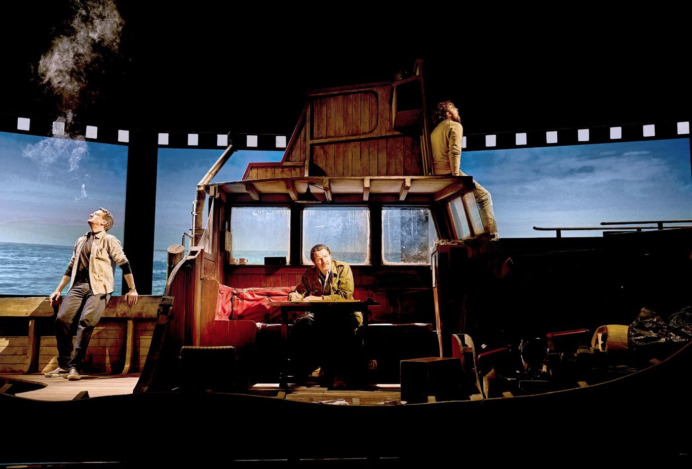 The set, by Duncan Henderson really did set us sail on the open water, with three LED screens displaying the vast expanse of the Atlantic Ocean amongst film reel, reminding us of the big screen this film inhabited back in the 70’s. The clever use of subtle background noise of the creaking of the boat, and the jolts of the performers when hitting a wave made us feel completely immersed and if I’m honest, had me swaying in my seat!