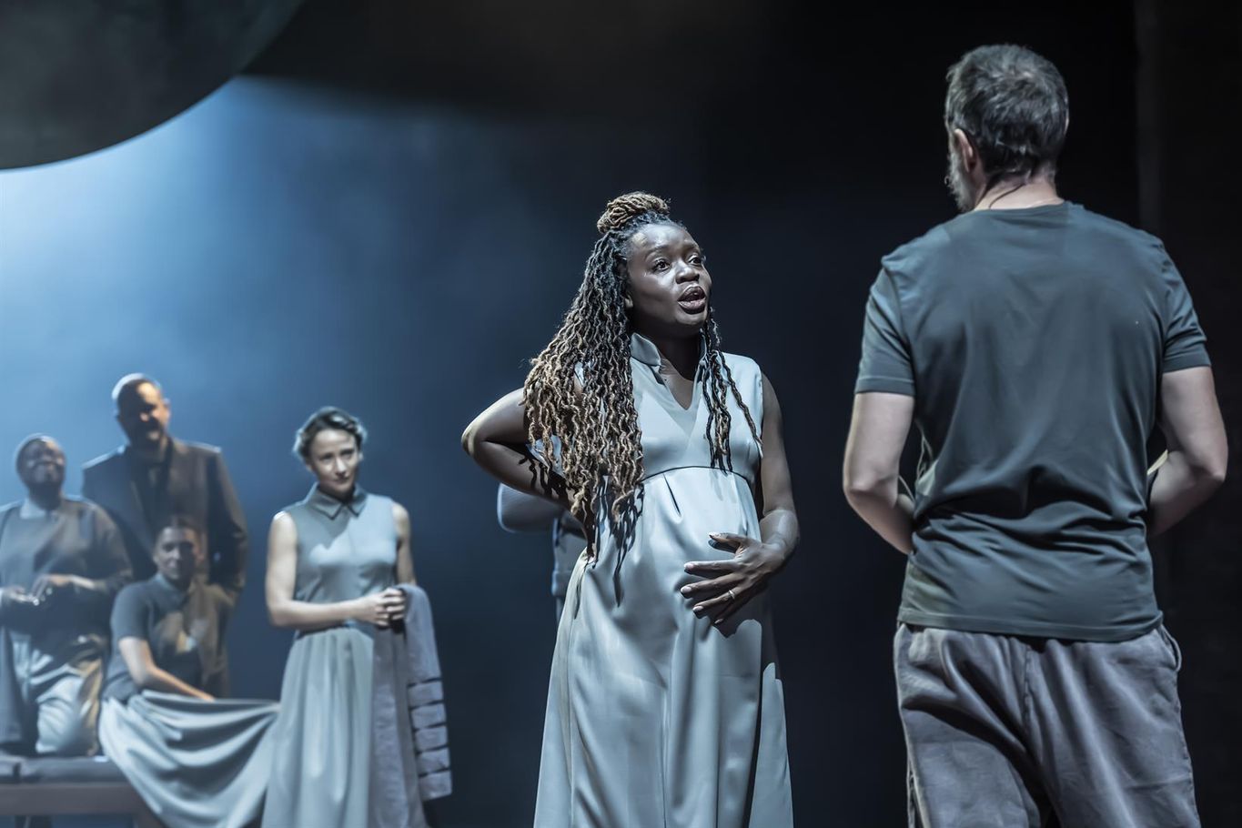 Yael Farber’s direction sees the story told in continuation, as one scene ends it plays out in the background as the next scene begins at the forefront of the stage. This makes the flow of the story consistent and works well. The Costume design by Soutra Gilmour in mostly greys and blacks, representing the dark tale playing out, whilst Perdita is represented in Red, both as a newborn and as a young adult, emphasising her characters position in reuniting the two kingdoms love for each other and the courage to accept their mistakes. Gilmour’s Set Design combined with Lighting Design by Tim Lutkin creates an atmospheric stage, in particular Act 2 sees the celebration of the solstice feast, the movement (Imogen Knight), music (Composed by Max Perryment) and colours of this scene are a delightful plethora for the senses, and we feel the happier side to Perdita’s life as opposed to the darkness of her father’s kingdom.