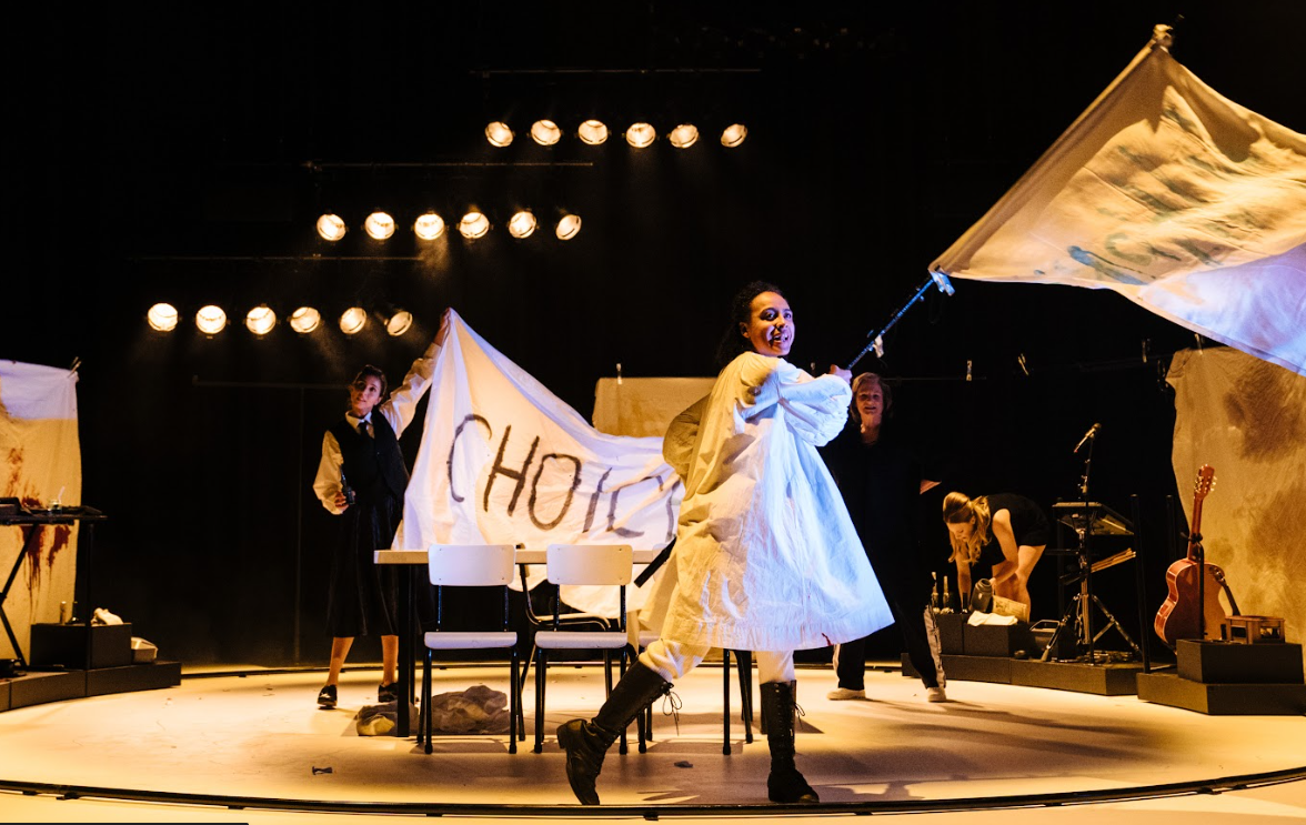 It cleverly uses the device of using each of the 5 fantastic actors to recreate the main character’s different ages and identities, during her different stages of life. The actors are onstage throughout, and when not playing the character are her friends, sisters, mum, aunt, children and so on. The decades start with the imagery of one of the actors standing in front of a white canvas sheet, and a photo being described.