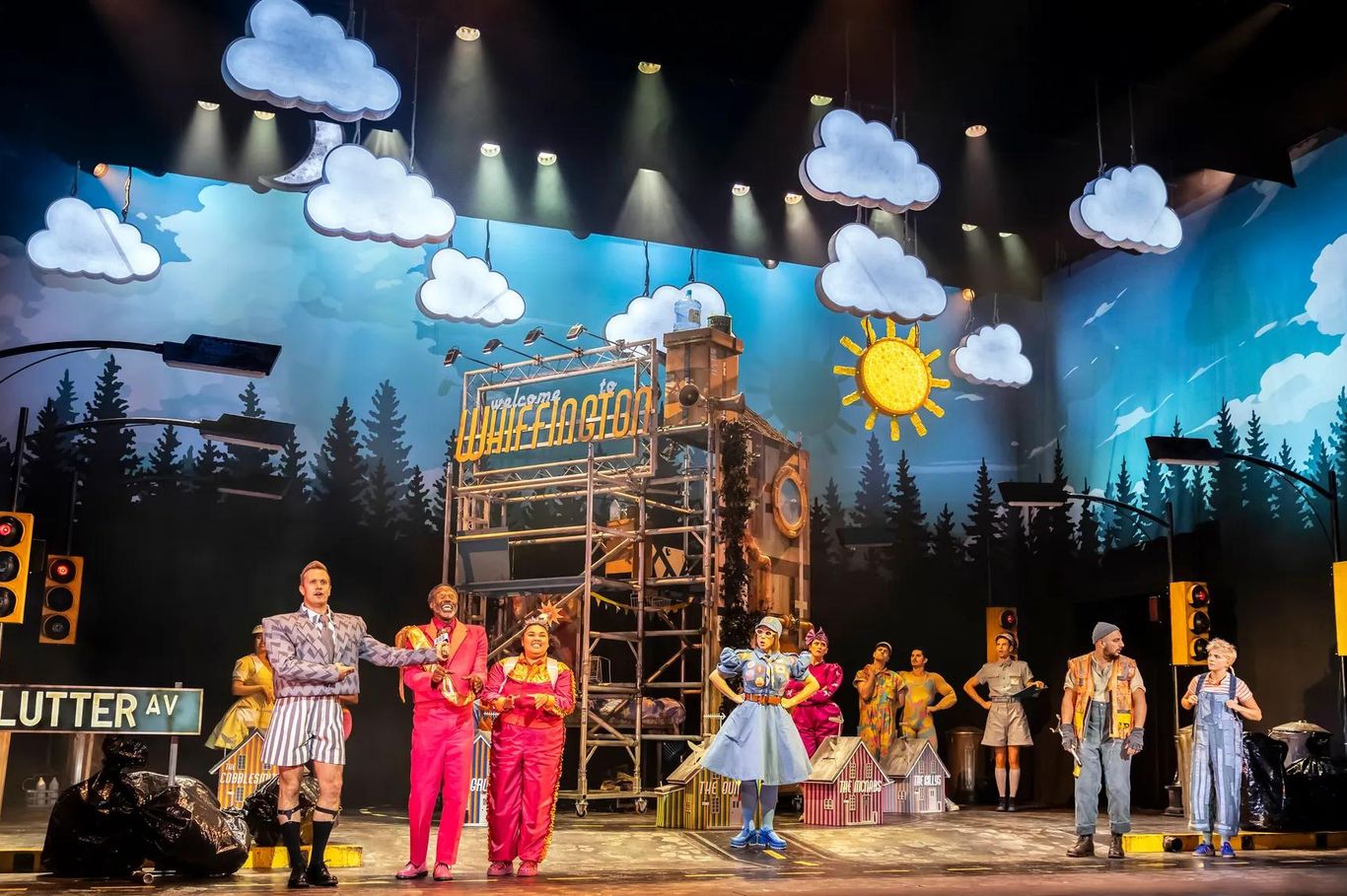 The show starts with and eerie atmosphere before opening to a bright comic book style town, with larger-than-life characters. We find ourselves on ‘Clutter Avenue’ where Lucy lives with her father in a house made of cardboard, scaffolding and seemingly odds and ends her father has found at his job at the town dump. A highlight of the piece is the set design from Andrew Exeter, it is mostly made from recycled materials such as a moon made from a boat sail, light up clouds covered in tarpaulin and a sun with recycled bottles, which gives is a beautiful rustic feel while also feeling they have been pulled straight from a child’s imagination.