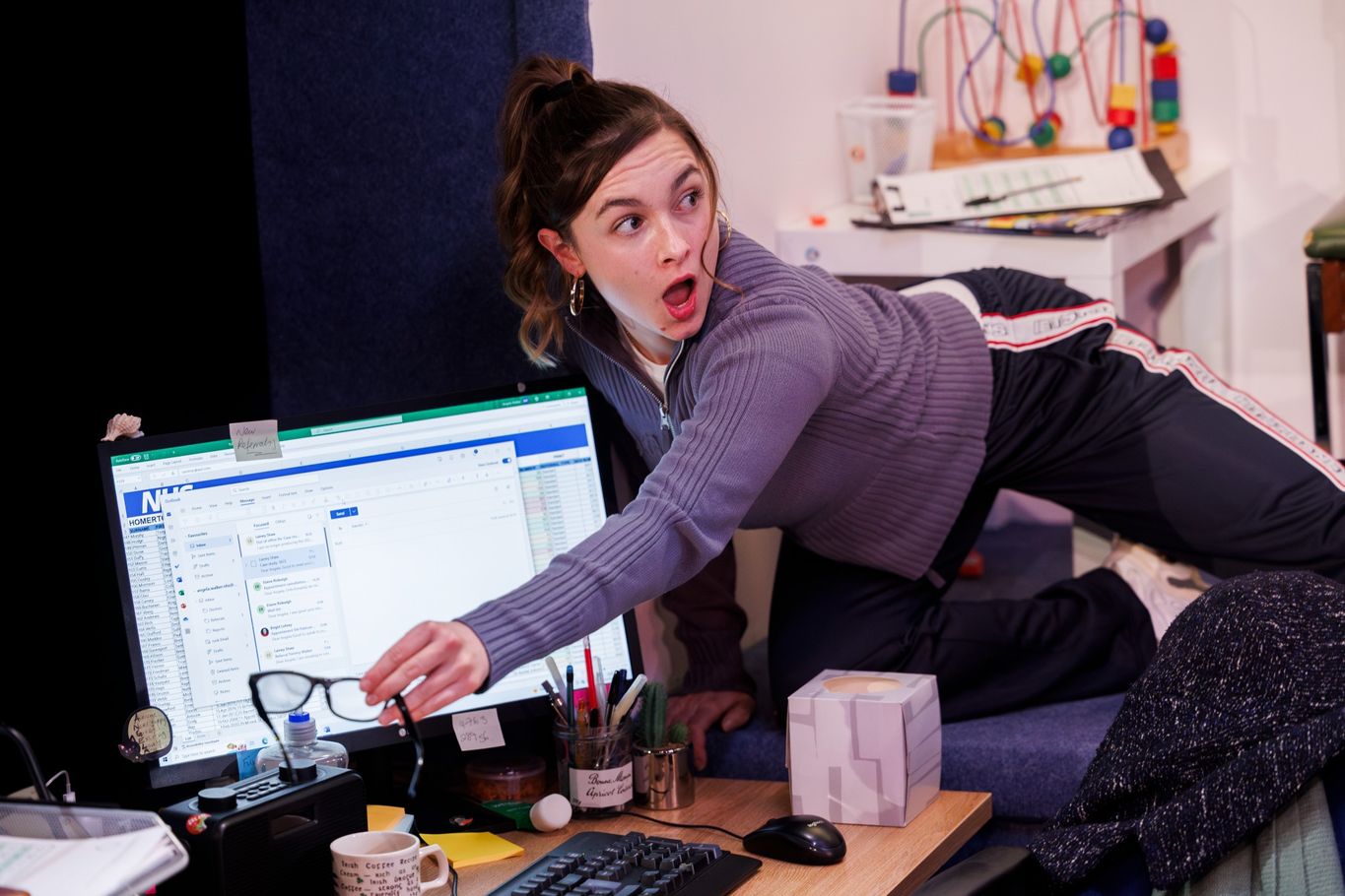 Being an intimate 60-seater venue, the performance space accurately demonstrates a typical office environment, two desks crammed in, both covered with papers, stacked high like a fort, a waiting room with scattered kids’ drawings and toys and leaflets on the wall. We are introduced to the NHS Children and Adolescent Mental Health Service (CAMHS), 4th floor outpatient facility.