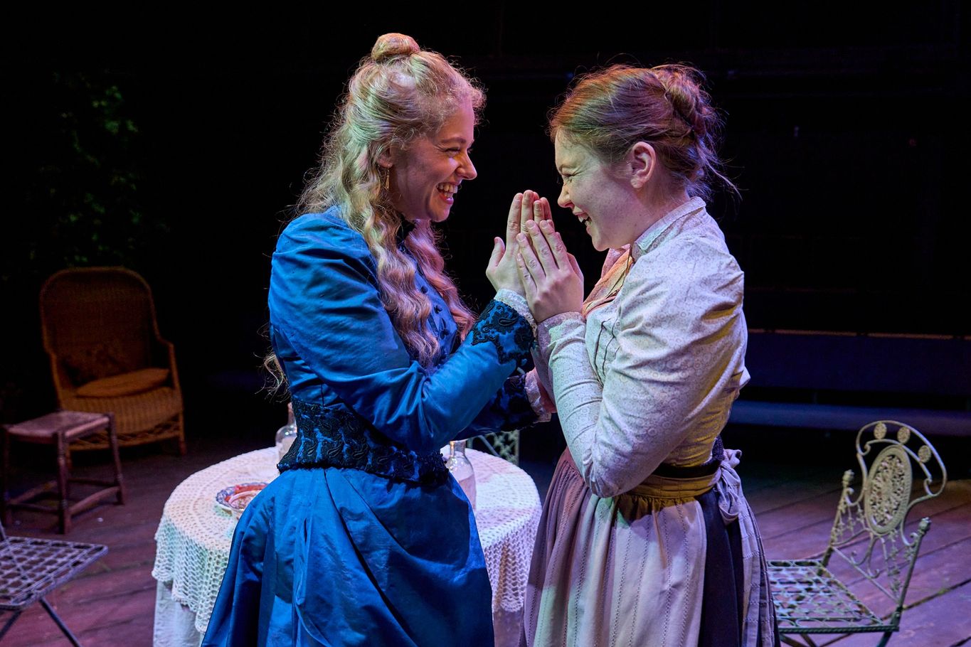 Looking around designer Simon Daw’s set, the garden terrace may not be fully naturalistic, but surely possesses exquisite detail. Lily Sacofsky, who plays the young second wife Elena, has her hair worn in luxuriously intricate braids and curls that no one living with modern-day distraction will ever have the time to pull off. (Honestly, how does hair and wigs supervisor Chris Smyth pull it off?)