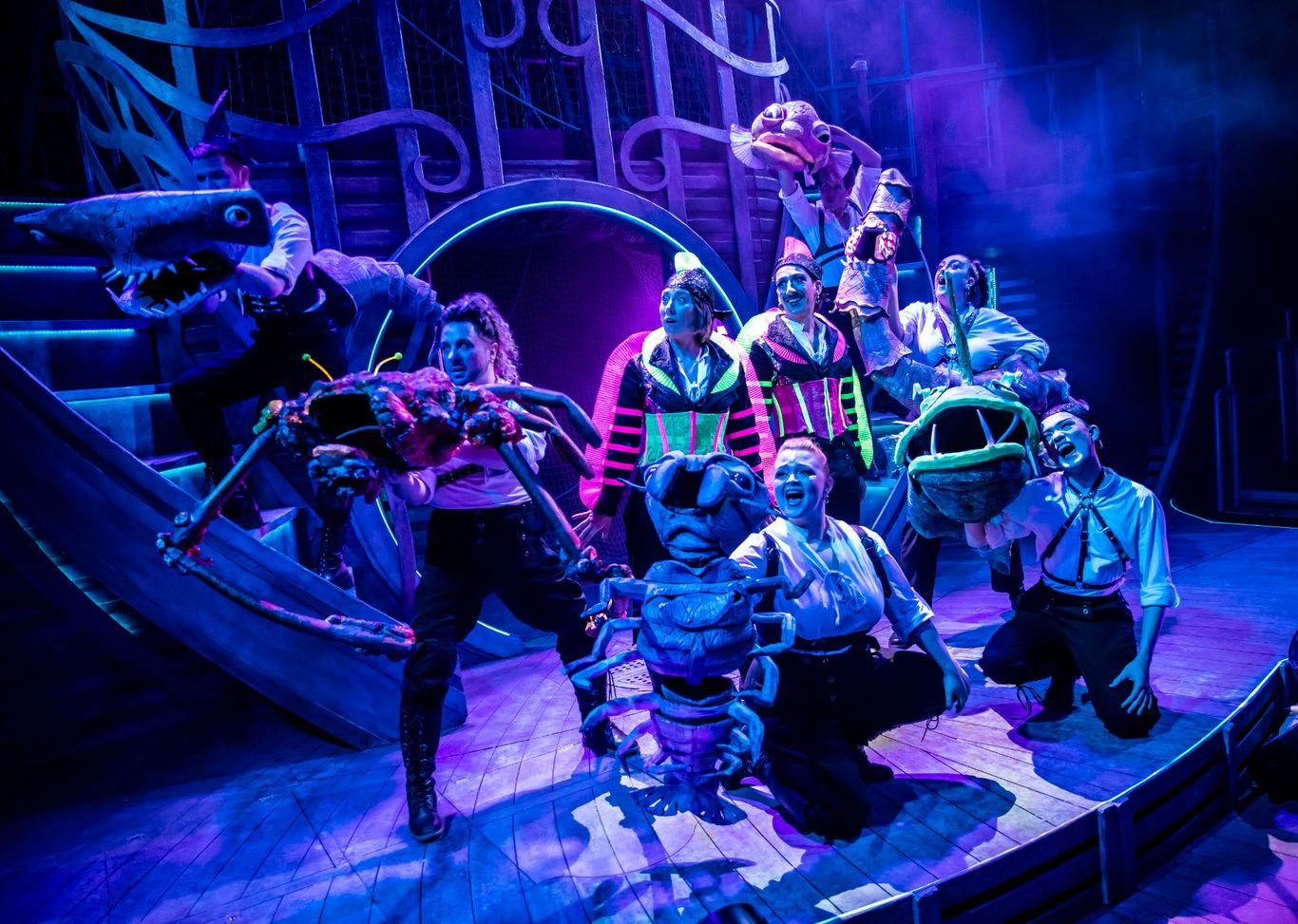 Telling of her love affair with Triton, played magnificently by Thomas Lowe, we delve deep into the bottom of the sea where we meet those familiar Disney characters synonymous with The Little Mermaid film, including Sebastian (Allie Dart), Eric (Jamie Mawson) and a whole host of scary looking sea creatures who ‘Didn’t Make it to Disney’. This show is full of hilarious side swipes at the great Disney empire, flipping its fairy-tale vibe completely on its head to comical effect.