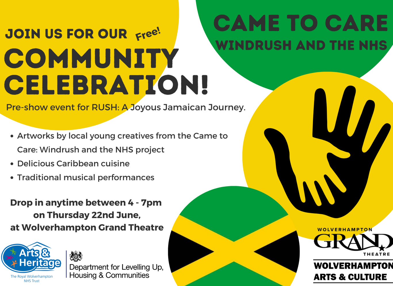 To mark the occasion, a public event on 22nd June at the Grand Theatre will share four pieces of work from a project that sees funded commissions by young creatives from Wolverhampton’s Caribbean community. Through their commissions, the young artists have researched the entwined stories of Windrush and the NHS in the local area. They have taken part in workshops at local cultural institutions (such as Wolverhampton Art Gallery and City Archives) to develop their creative piece. Delicious Caribbean cuisine will also be available.